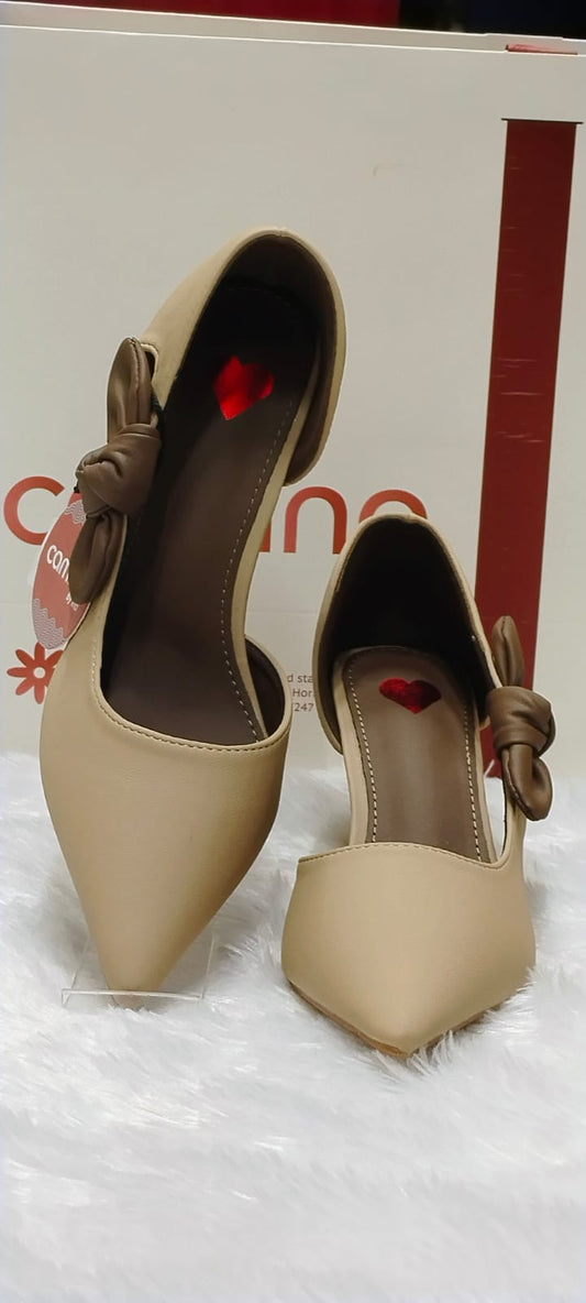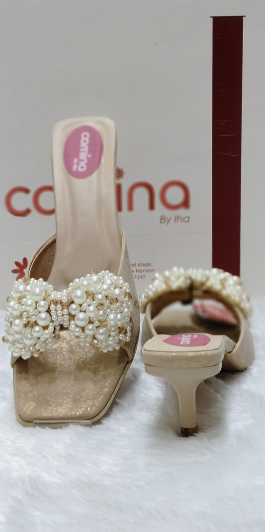 Golden Pearl-Embellished Bow Heels with Cushioned Comfort & Stylish Mid Heel A196